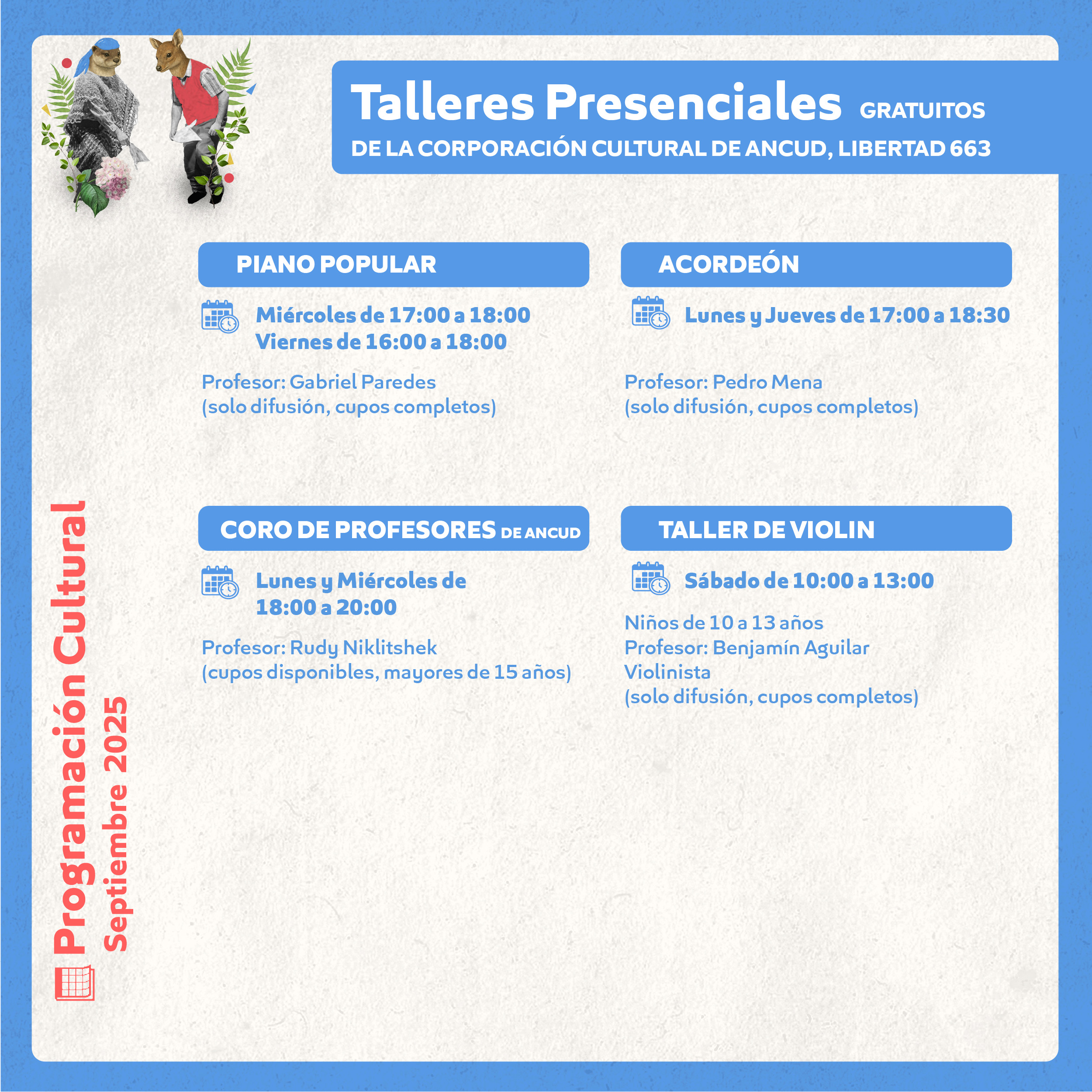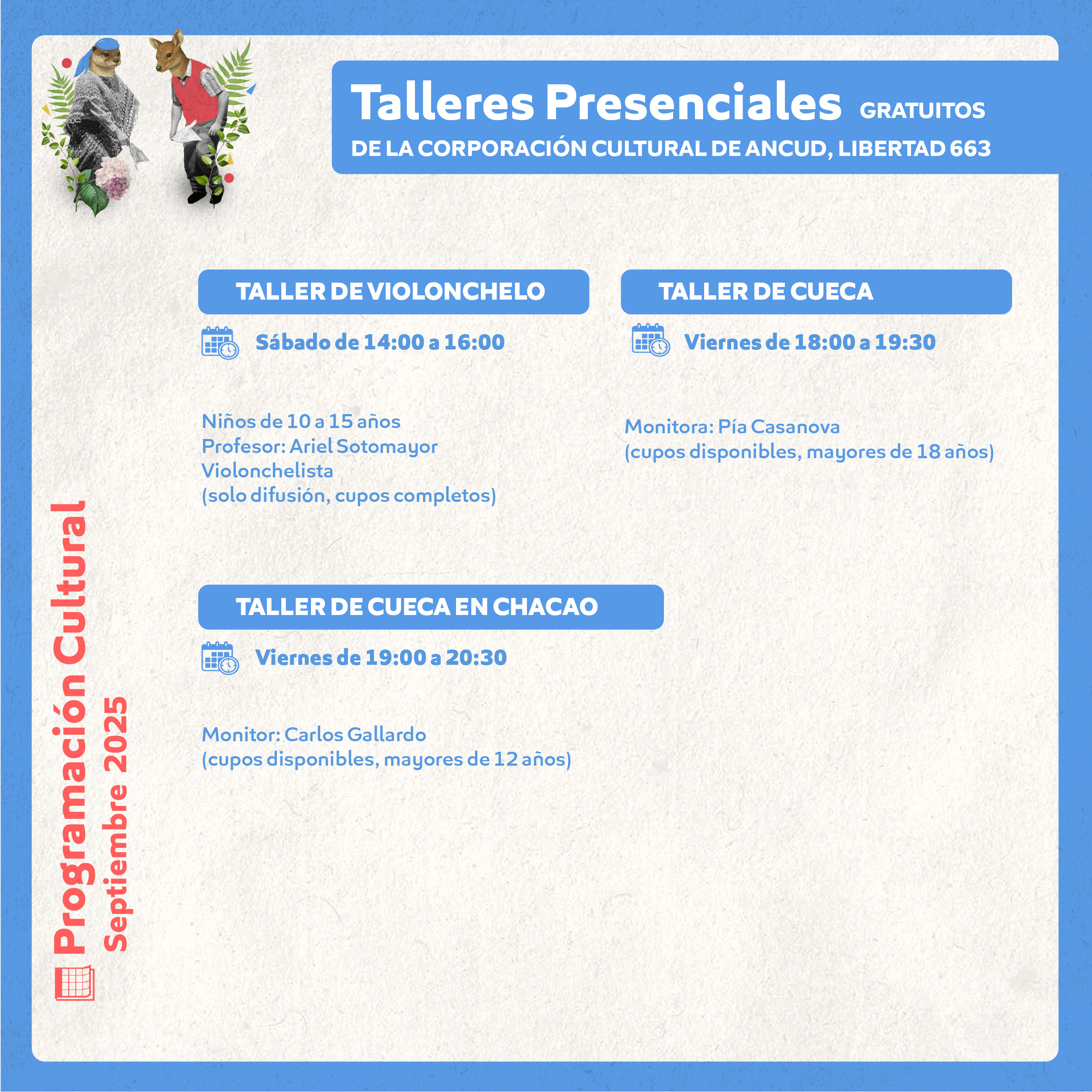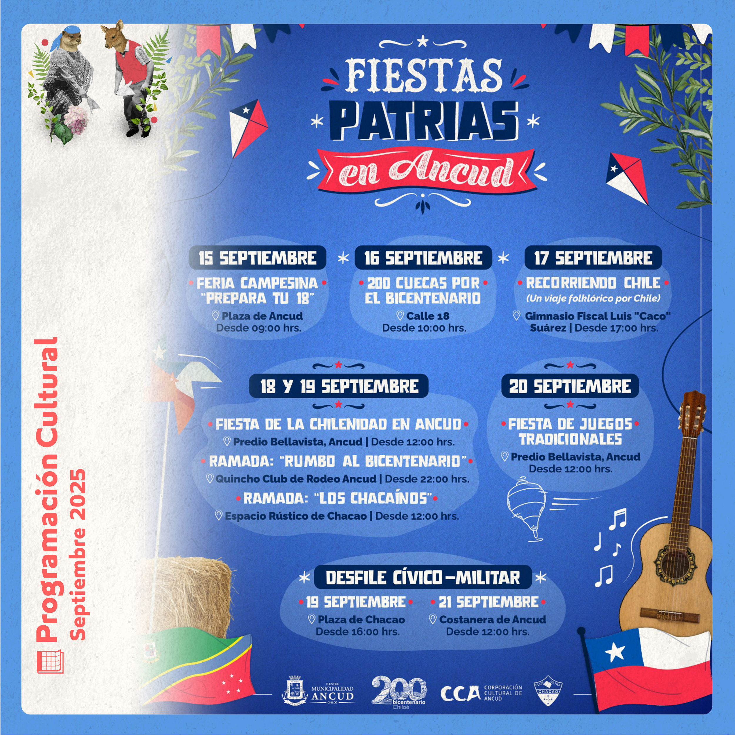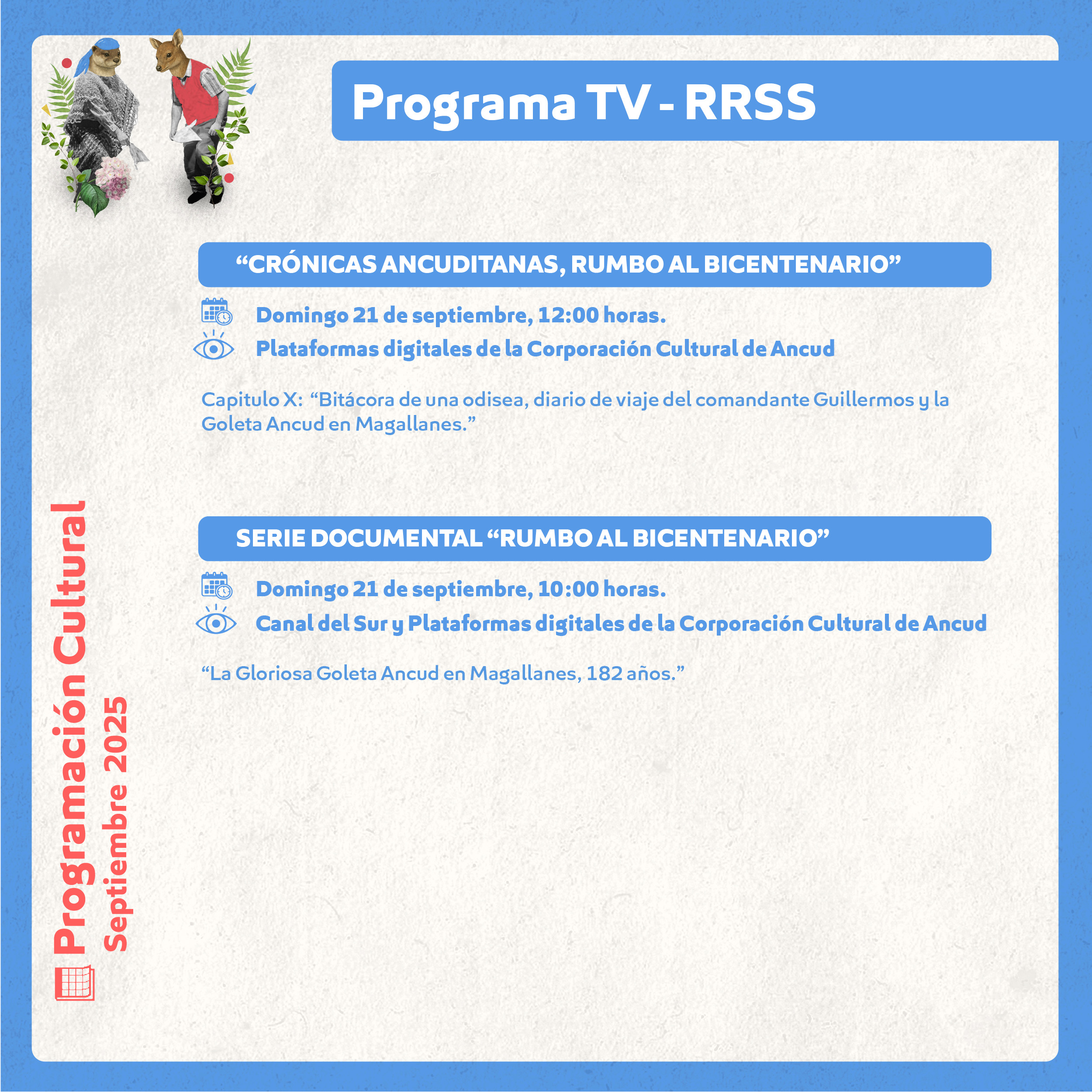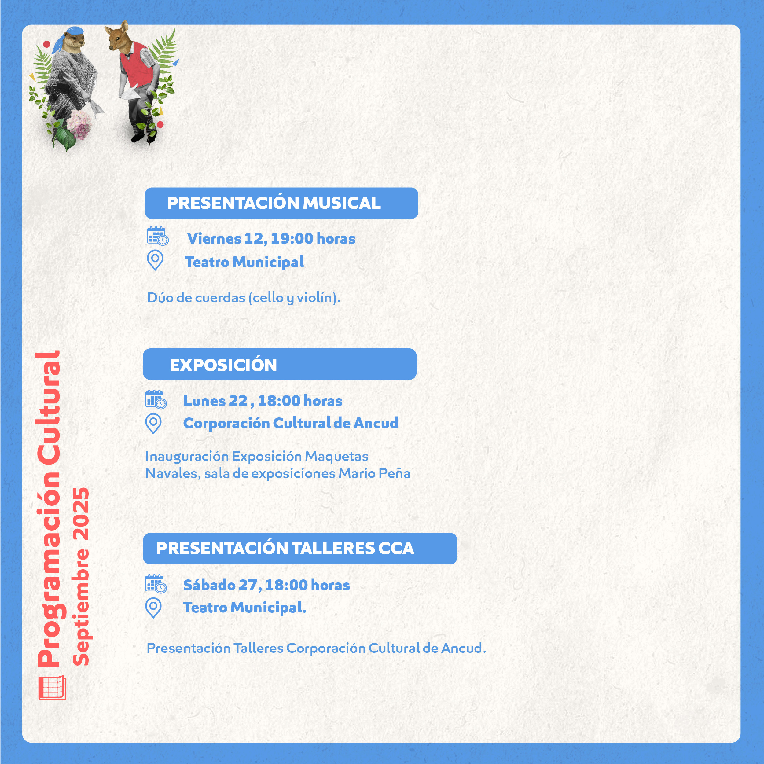 Inicio Noticias Programación Cultural Septiembre 2025 Noticias Programación Cultural Septiembre 2025 01/09/2025 643 Facebook Twitter Google+ Pinterest WhatsApp Artículo relacionadosMás del autor PROGRAMACIÓN CULTURAL MARZO 2026 Con gran éxito se desarrolló la 2ª Muestra Gastronómica, Folclórica y Artesanal de Ancud en el Parque Bellavista Corporación Cultural de Ancud publica resultados de postulaciones al Festival Sello Chilote 2026 Corporación Cultural de Ancud presenta su Programación Cultural de Diciembre 2025: actividades gratuitas para toda la comunidad “PROGRAMACIÓN TEATRO ANCUD 2025” CULMINA CON MÁS DE 15 ACTIVIDADES ARTÍSTICAS Y POSICIONA A ANCUD COMO REFERENTE CULTURAL EN CHILOÉ
