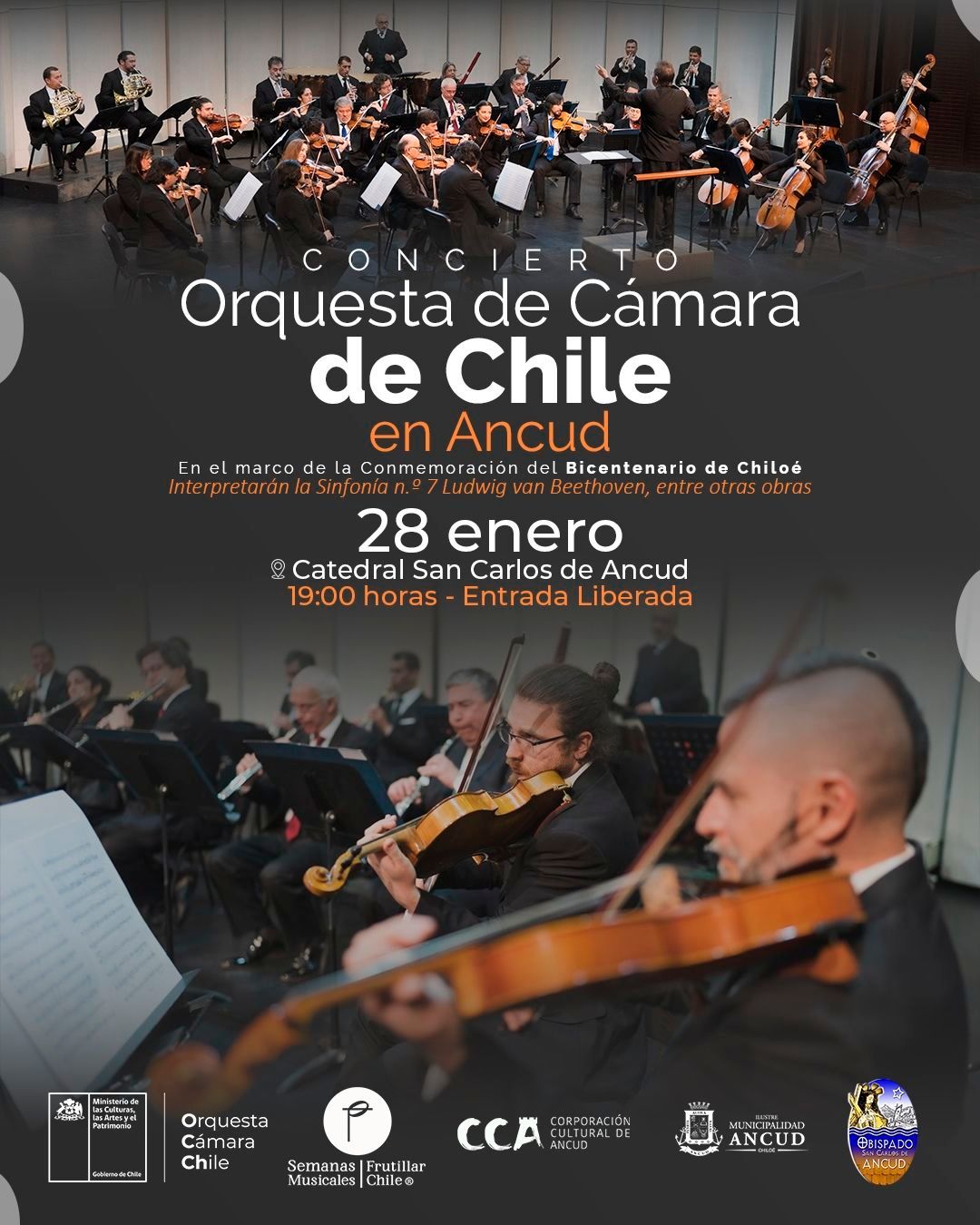 En el contexto de la conmemoración del Bicentenario de Chiloé, la ciudad de Ancud se prepara para vivir un hito cultural de alto nivel con la presentación de la Orquesta de Cámara de Chile, uno de los elencos más destacados del país. La Corporación Cultural de Ancud invita a toda la comunidad a conocer, disfrutar y vivir la música como una expresión fundamental de nuestro patrimonio cultural.