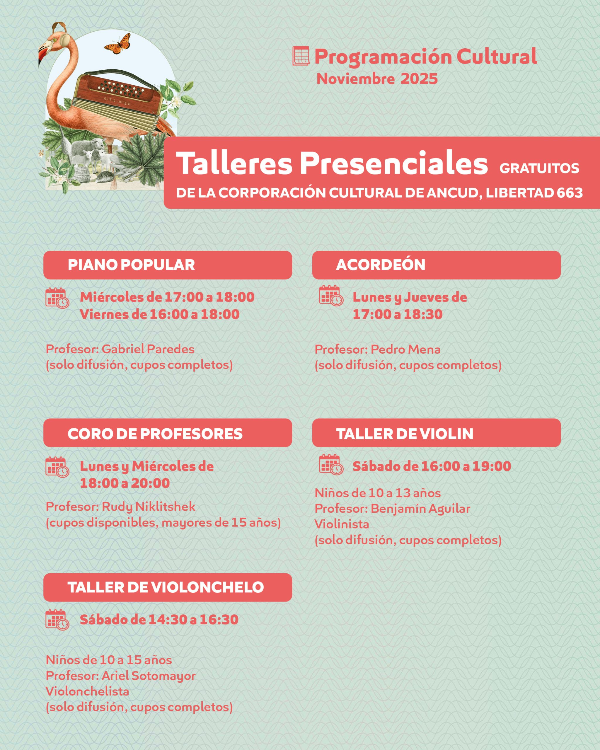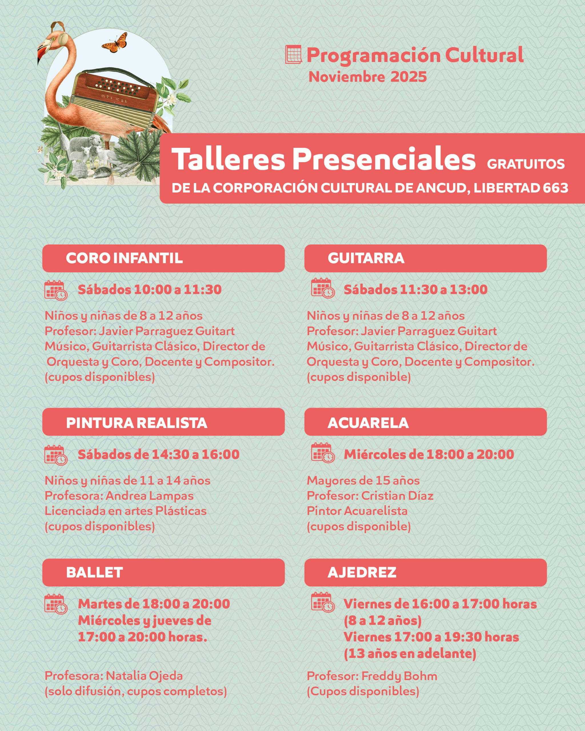 En paralelo, continúan los talleres presenciales gratuitos en la sede de la Corporación (Libertad 663), con cupos disponibles en disciplinas como pintura realista, acuarela, coro infantil, guitarra y ajedrez, entre otros, impartidos por destacados profesores locales.