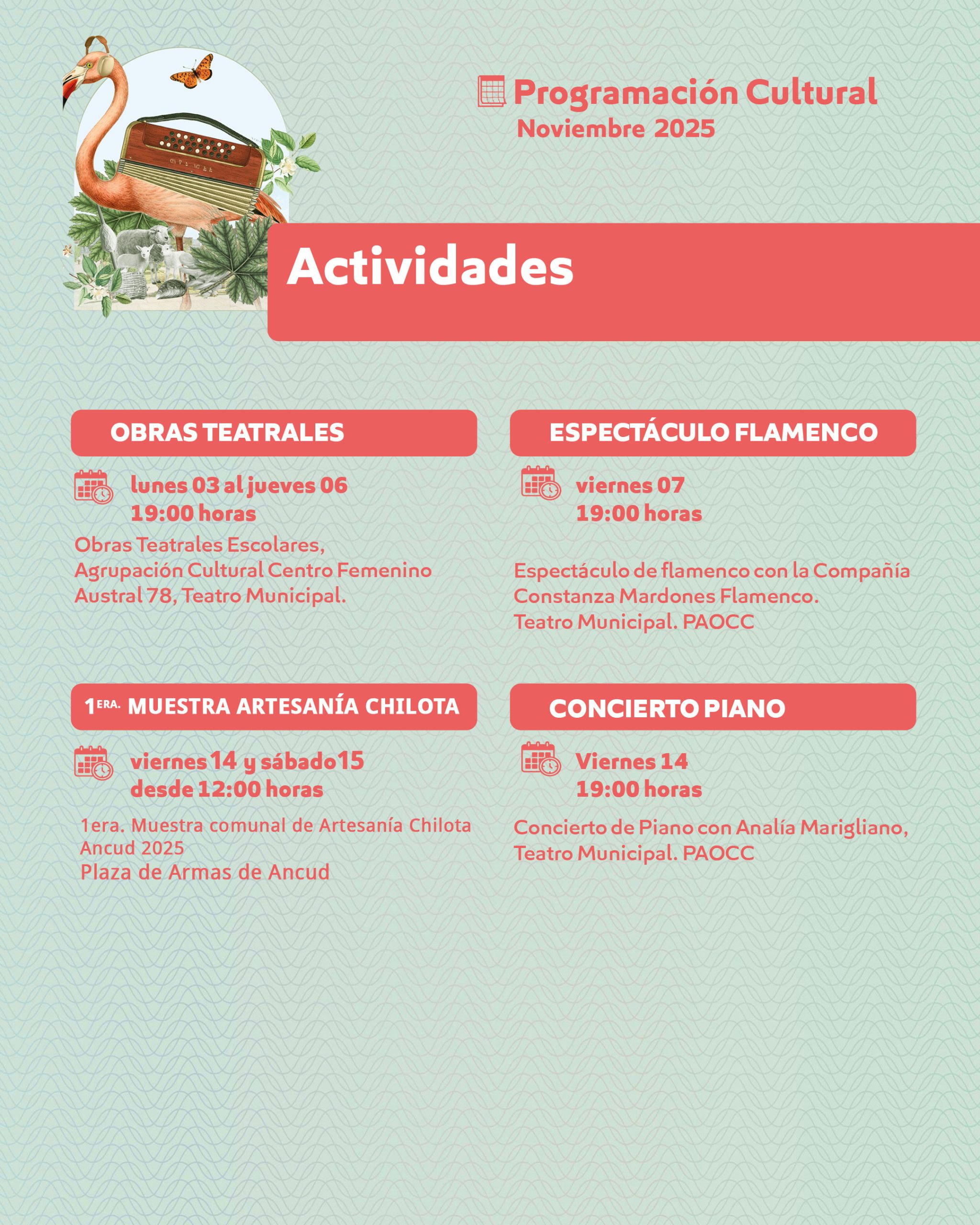 La programación también contempla el espectáculo flamenco de la Compañía Constanza Mardones Flamenco (viernes 7), funciones teatrales escolares de la Agrupación Cultural Centro Femenino Austral 78, y la 1ª Muestra Comunal de Artesanía Chilota 2025 en la Plaza de Armas.