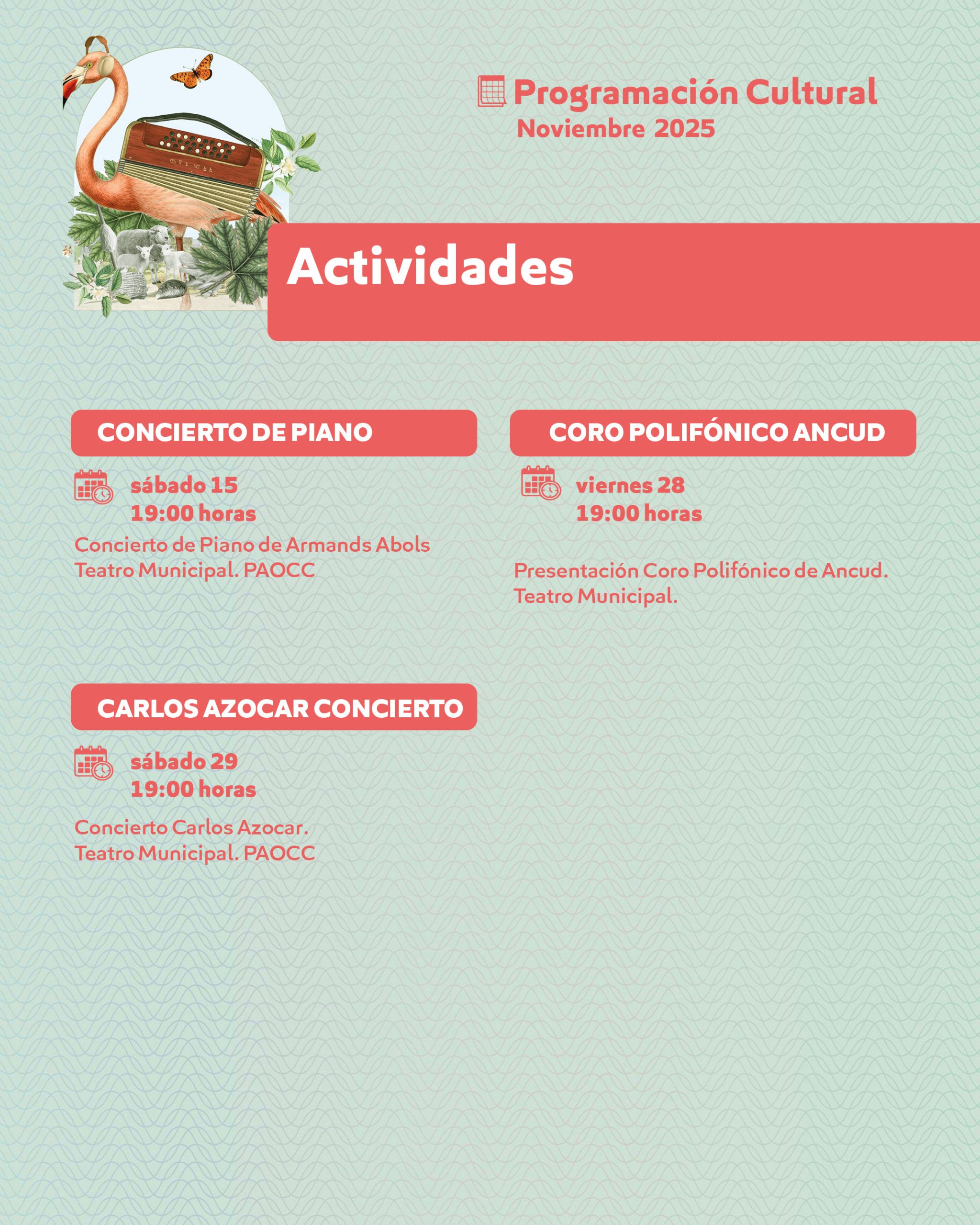 Entre las actividades destacadas se encuentran los conciertos de piano a cargo de Analía Marigliano (viernes 14) y Armands Abols (sábado 15) y el concierto de Carlos Azócar (sábado 29), todos en el Teatro Municipal de Ancud con el apoyo del Programa de Apoyo a Organizaciones Culturales Colaboradoras (PAOCC) del Ministerio de las Culturas, las Artes y el Patrimonio.