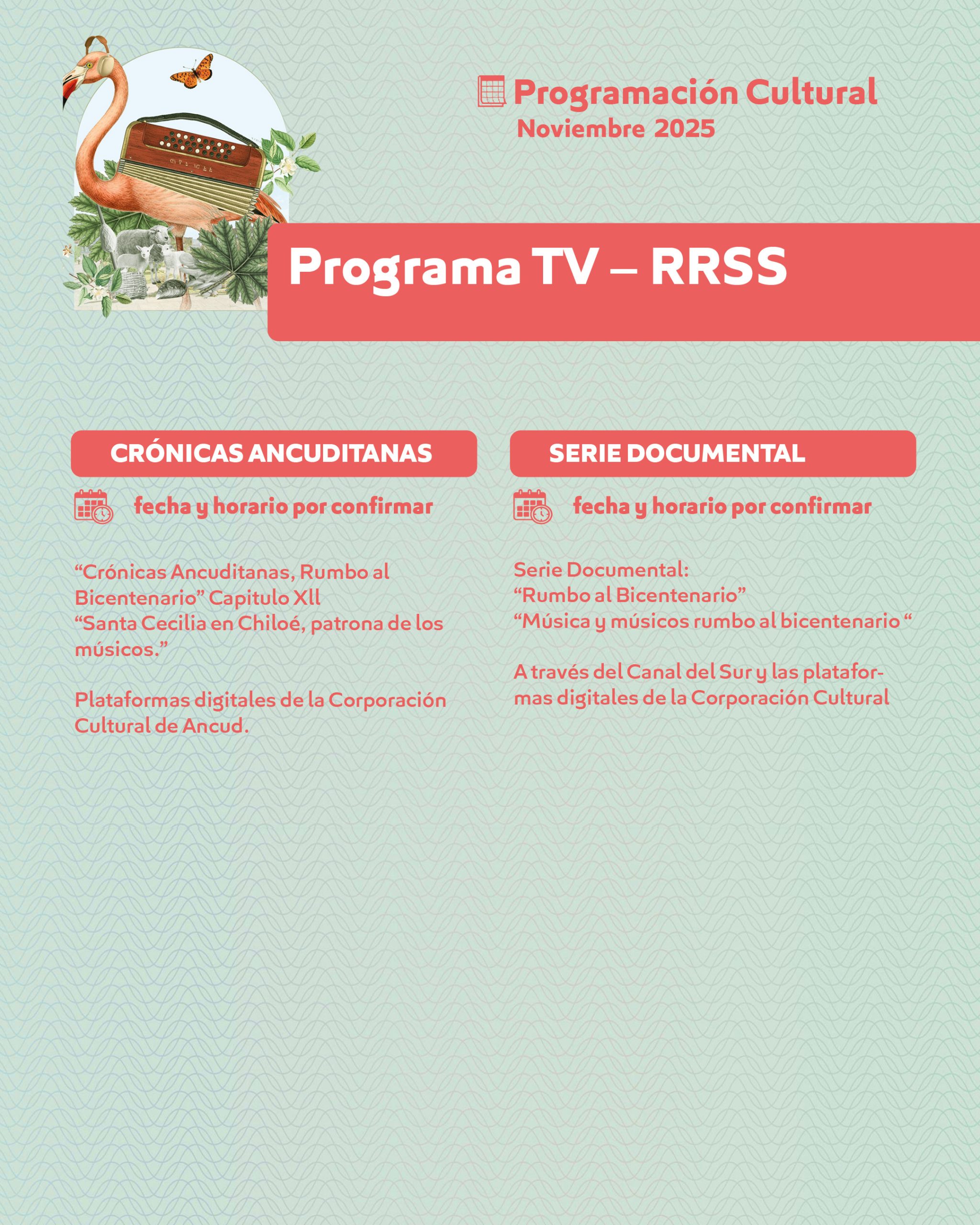 Finalmente, las plataformas digitales de la Corporación presentarán nuevas ediciones de los programas “Crónicas Ancuditanas, Rumbo al Bicentenario” y la serie documental “Música y músicos rumbo al Bicentenario”, difundidos a través del Canal del Sur y las redes sociales institucionales.